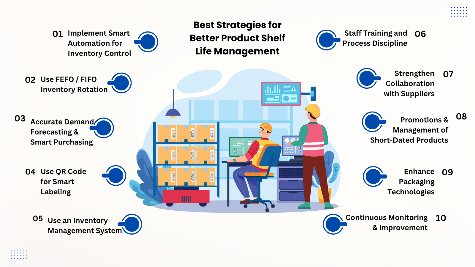The last strategy for effective inventory shelf life management is to establish ongoing monitoring and improvement practices. Measure key metrics, such as spoilage rate, inventory turnover, waste levels, storage conditions, etc.
