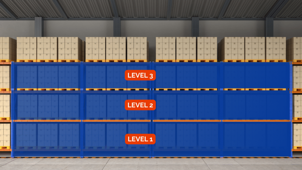 It indicates the vertical position within a bay. It starts at Level 1 on the floor and moves to higher levels (2, 3, 4…) for bulk or overflow storage.