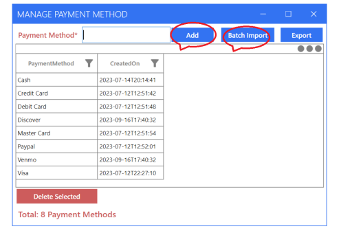 In the ‘Settings’ tab, you can manage your Payment Methods, Payment Terms, Taxing Schemas, and Shipping Methods. Just like adding locations, brands, and categories, you can add, batch import, delete, and export in an easy and straightforward manner.
