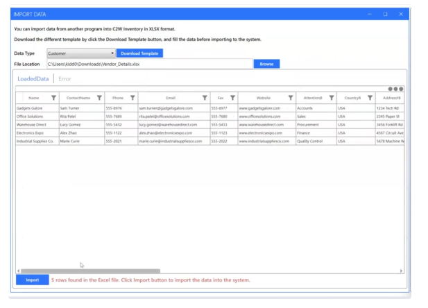 - Click ‘Import’. The system will validate the data. If errors are found, they will be displayed in the ‘Error’ tab. Errors can be fixed directly in the ‘LoadedData’ tab or in the Excel file.