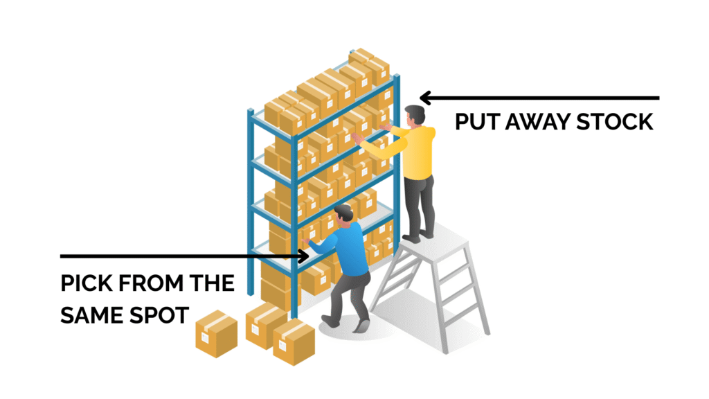 For example, at FreshMart, fast-selling items like milk cartons and bread are stored in put-pick bins located at waist height near the packing area. This setup allows staff to put newly received stock directly into these bins and pick from them immediately to fulfill orders. Overall, this minimizes handling time and speeds up the order fulfillment process.